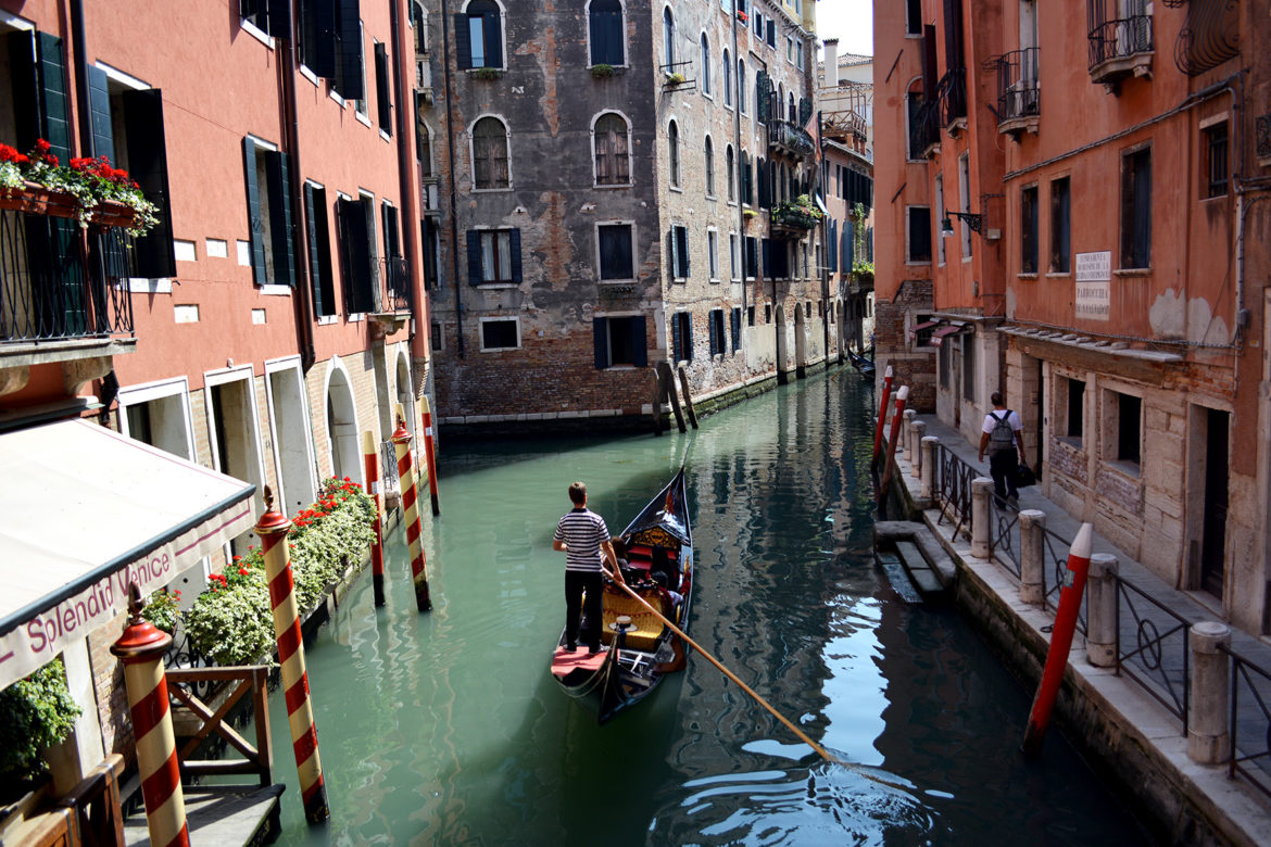 Durante o passeio, a imaginação voa enquanto se passa lado a lado dos corredores apertados, vários prédios (muitos são até tortos por conta das inundações) e milhares de universos das pessoas que moram por lá. De vez em quando tem um engarrafamento de gôndolas, mas logo logo se resolve. Alguns gondoleiros aproveitam para soltar a voz e cantar músicas tipicamente italianas. Tá bem, eu confesso que, é uma linha tênue entre a breguice e o ar romântico da cidade, mas em Veneza pode!